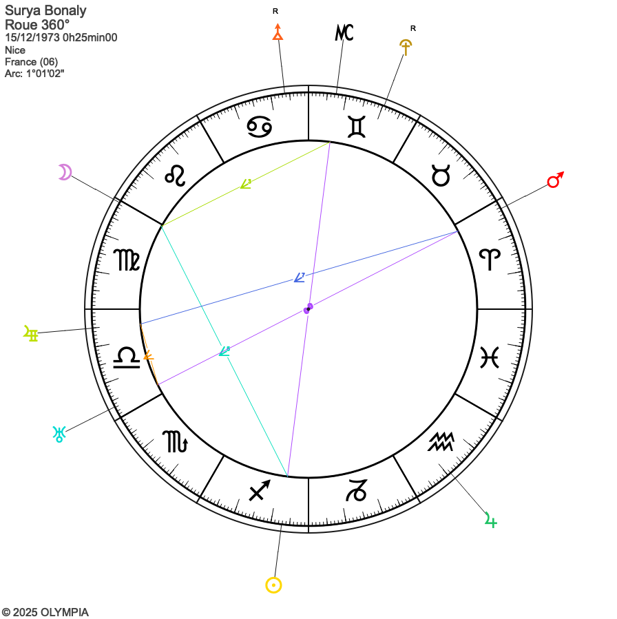 What do we see when we look at her chart? First of all, Mars Q in Aries B—the planet of physical and concrete action, energized by this sign—is in opposition k to Uranus T in Libra H, the planet of innovation here placed in an artistic sign. Moreover, both Mars Q and Uranus T are connected to Apollon e: Mars Q by a septisedecile r and Uranus T by a sedecile o. Apollon e is the planet of publicity and specialization, often involved in success, recognition, and achievement. Indeed, Apollon e masters its field, delves deep into subjects. Through its connection with Mars Q and Uranus T, these three planets together make Surya an expert in her physical discipline.