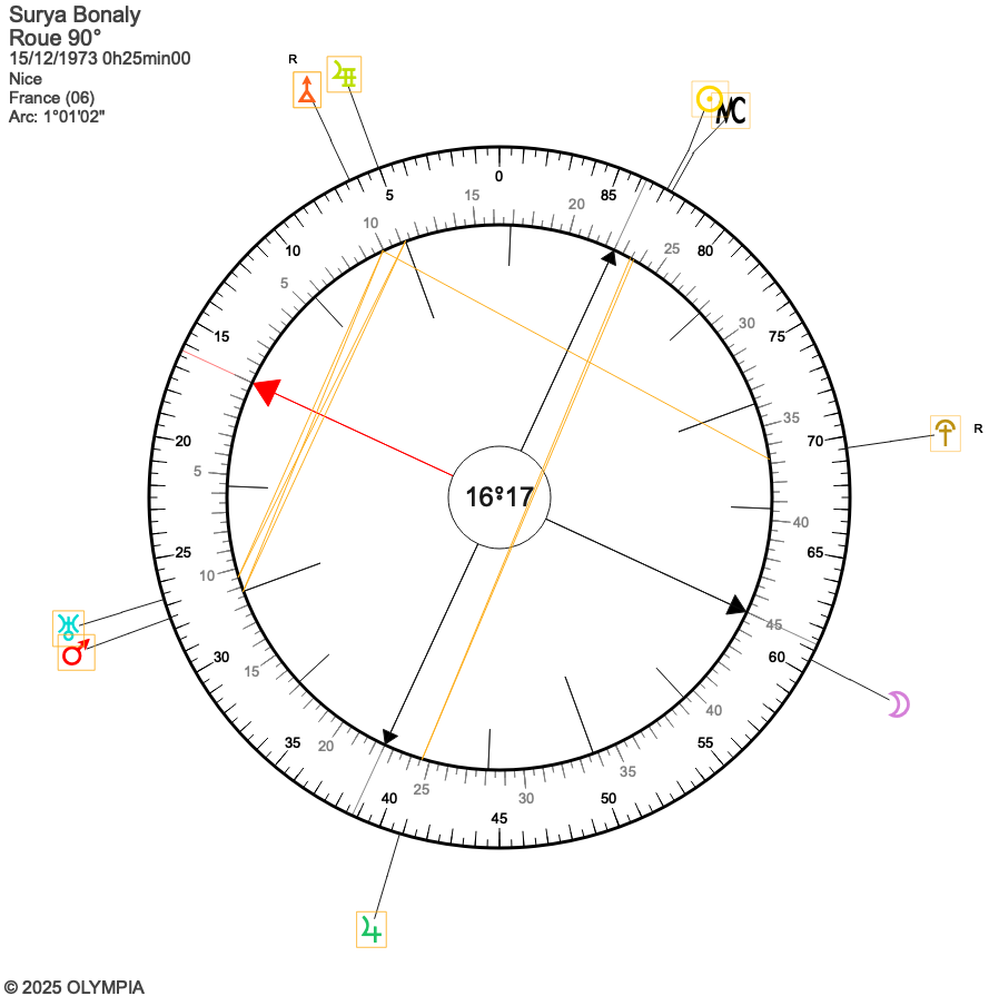 The conjunction j of the Sun N and the Midheaven < highlights Surya’s focus on the physical body (her first name, incidentally, means “Sun” in Hindi). This interest, in connection with Mars Q, led her from a very young age to become an athlete, practicing not only figure skating but also fencing, gymnastics, ballet, and diving. And by also connecting with Jupiter R—another planet of success, achievement, and honors—alongside Apollon e (which is the higher octave of Jupiter R), glory was guaranteed!